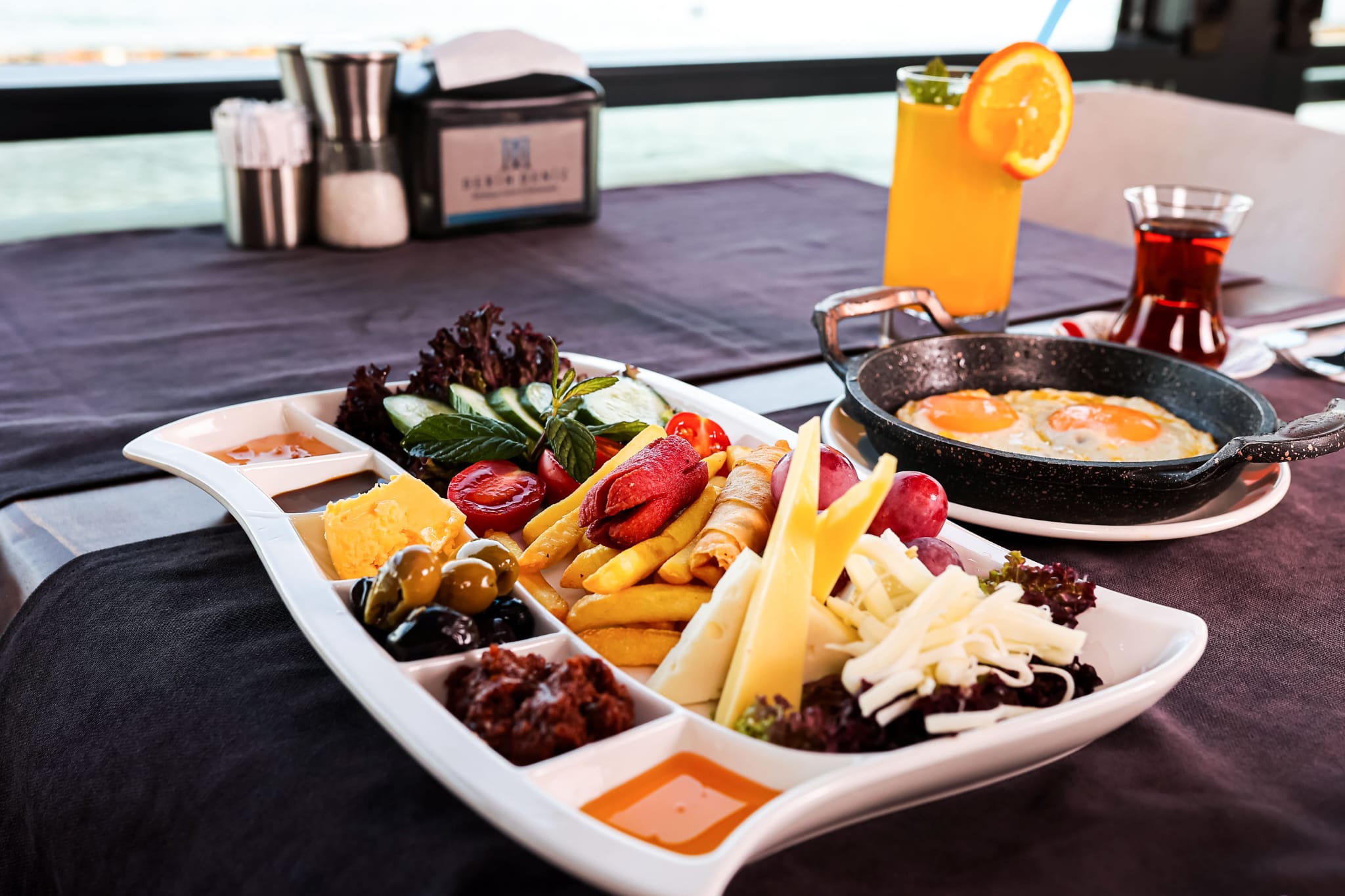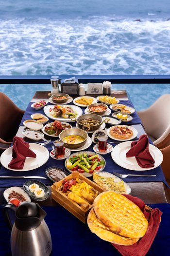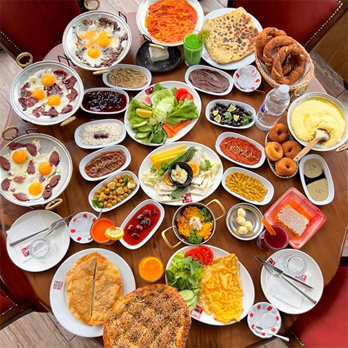 Peynir Çeşitleri, Zeytin Çeşitleri, Süzme Bal, Acuka, Mevsim Reçelleri, Domates, Salatalık, Patates Cips, Sigara Böreği, Sosis, Kakaolu Fındık Kreması, Tereyağı, Sahanda Yumurta, Bardak Çay