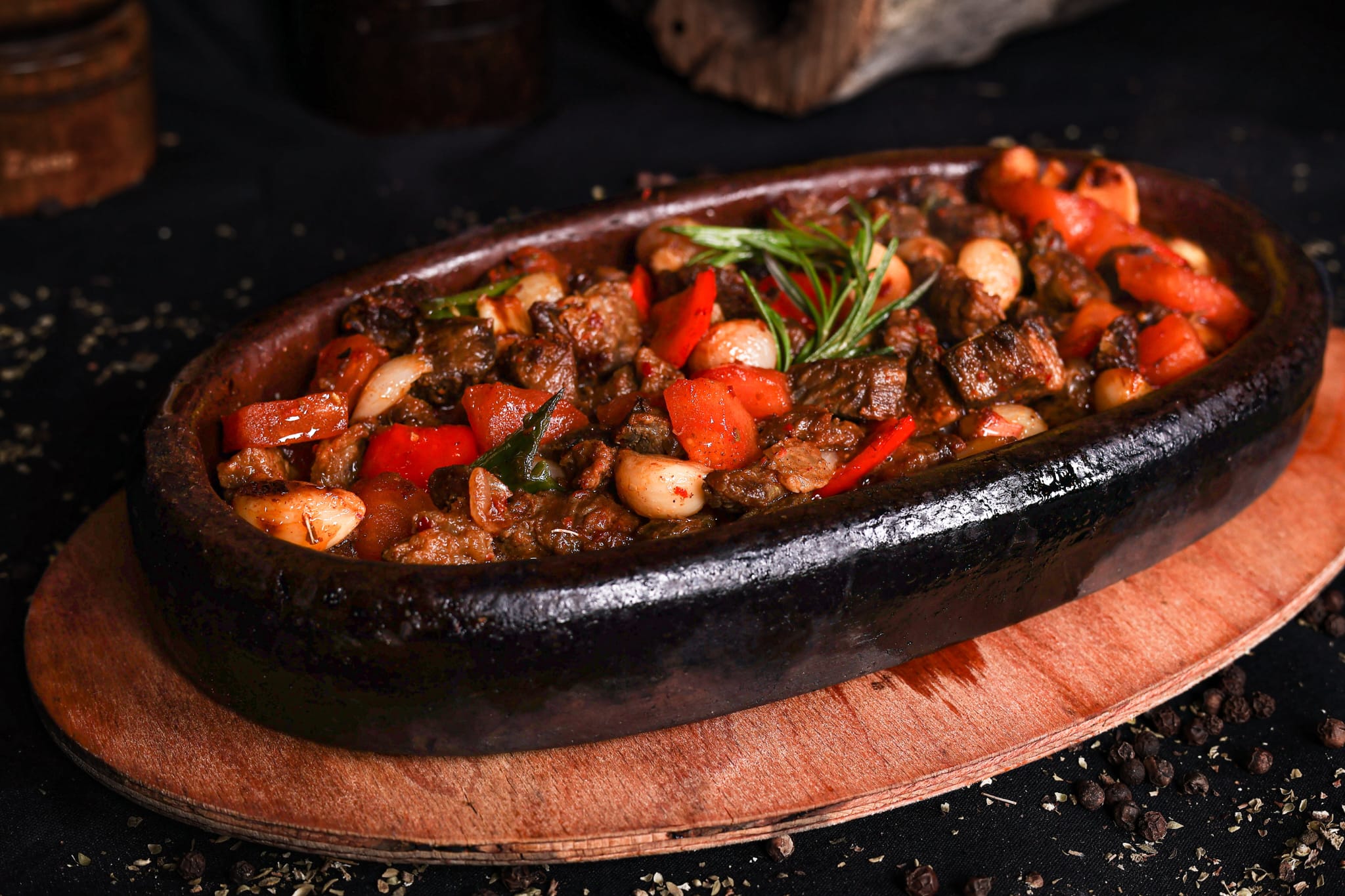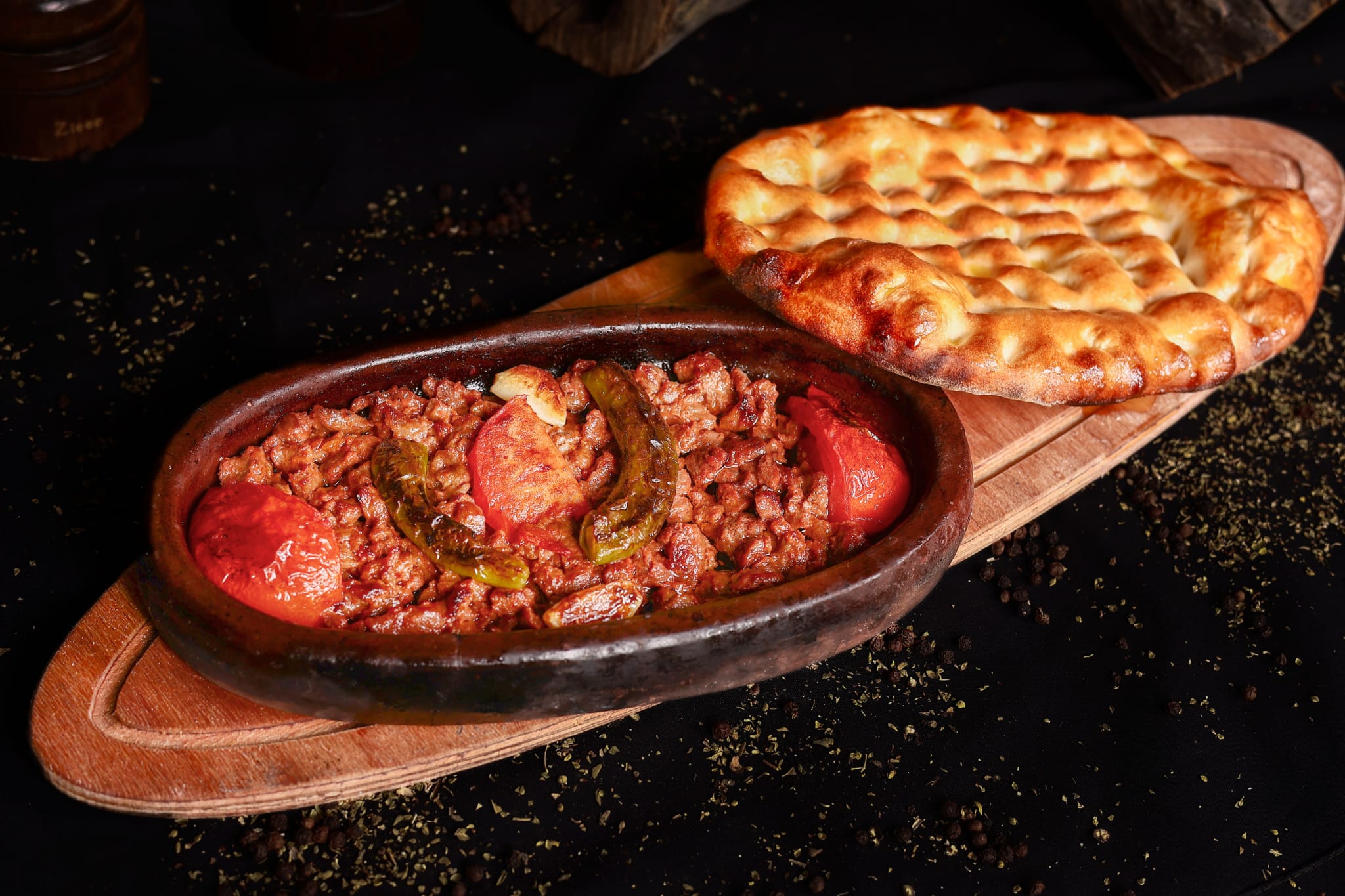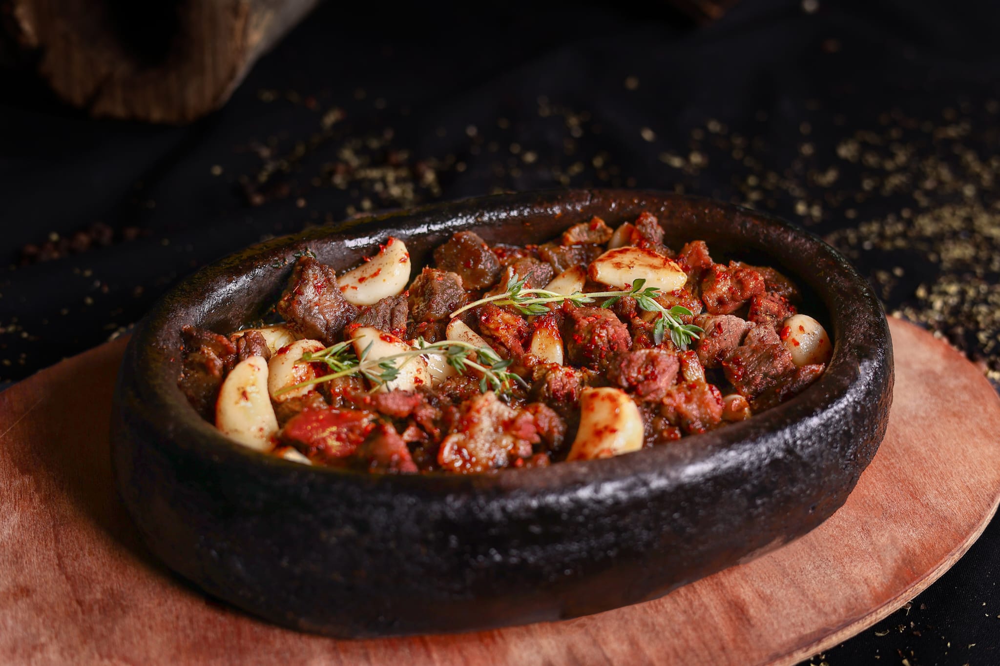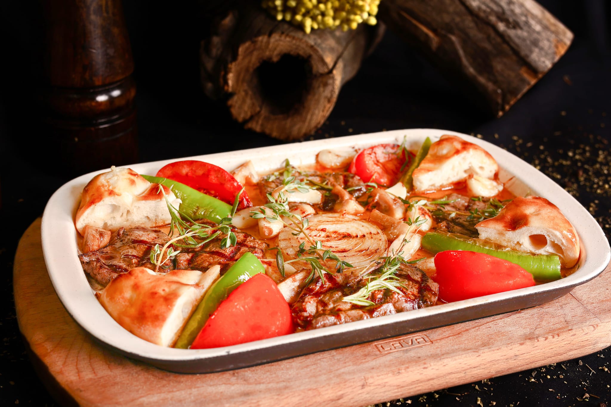 (Dana Bonfile Dilimleri, Arpacık Soğan, Kuşkonmaz, Mantar, Sarımsak, Bazlama Ekmeği, Tereyağ, Taze Kekik)