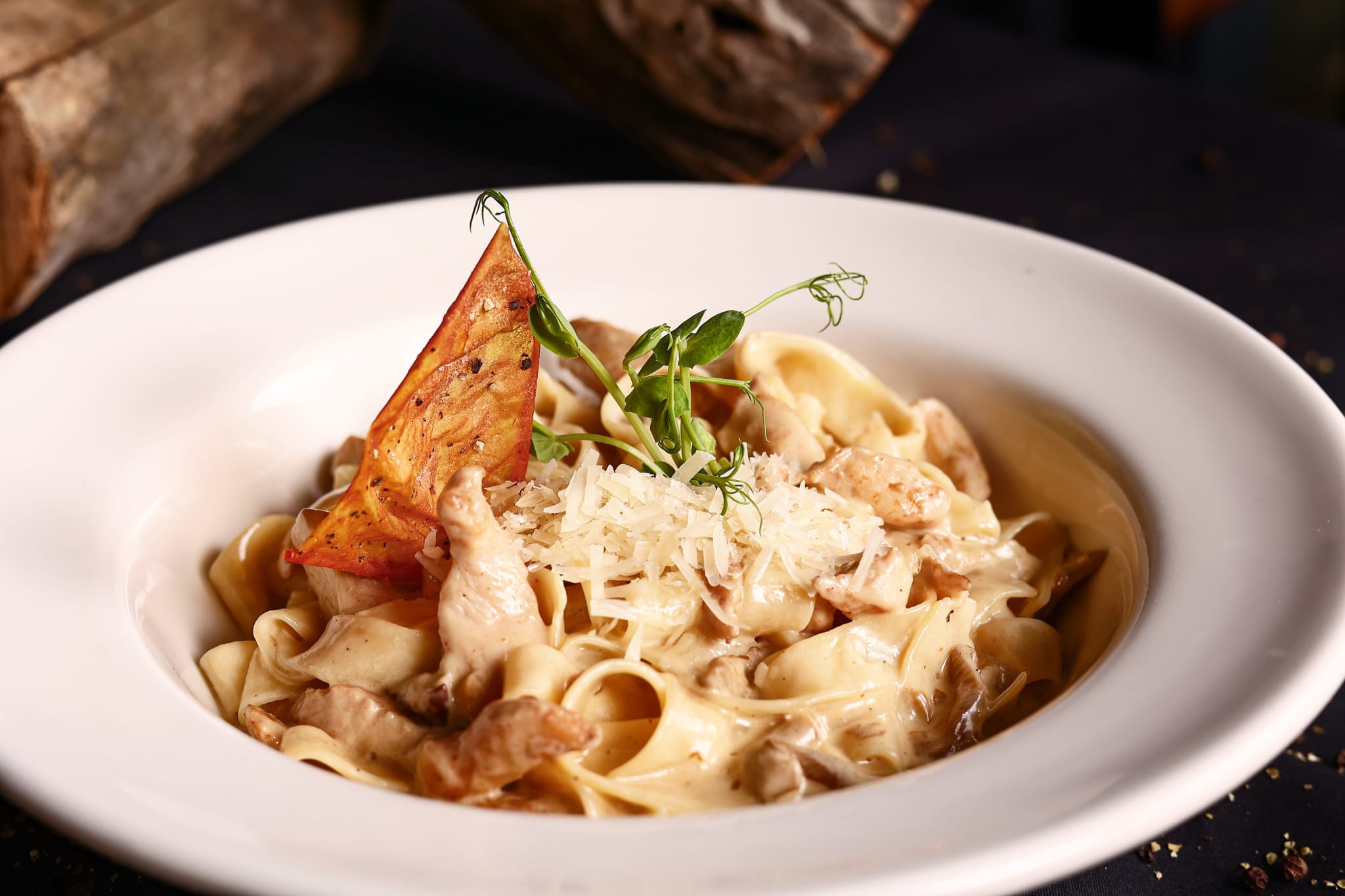 Fettucini Makarna, Tavuk Parçaları, Mantar, Parmesan peyniri, Tereyağı, Pesto sos